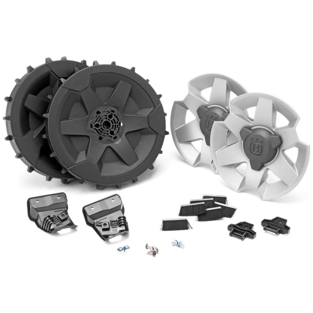 Kit containing course threaded wheels and wheel brushes for excellent traction on rough and sloping lawns.