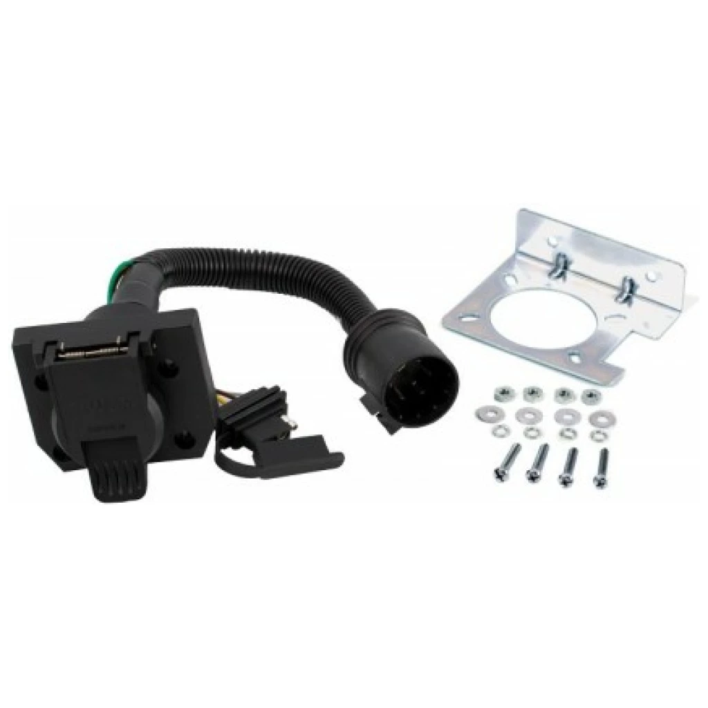 7-way RV or a 4-way flat trailer connector Adapter that plugs into the vehicle OEM harness receptacle to accept either a 7-way RV or a 4-way flat trailer connector. Includes bracket and mounting hardware.